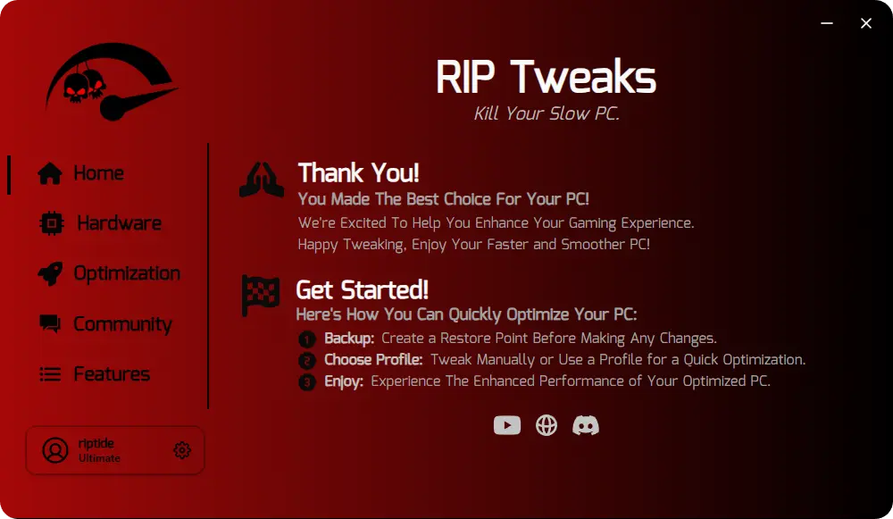 RIP Tweaks is an all-in-one Windows performance utility that brings together everything you need to maintain, optimize, and improve your PC in one place. It eliminates the need for multiple separate tools by offering a complete performance and system care solution.